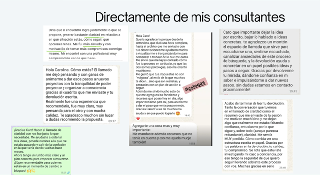 Transite con Caro un espacio de re orientación vocacional que se sintió un contenedor, es decir, un lugar seguro, cálido e íntimo en el que explorar libremente lo que me hacía obstáculo para tomar desiciones laborales y para ensayar y aproximarme a nuevas oportunidades que hasta entonces no veía como posibles. Súper recomendado!